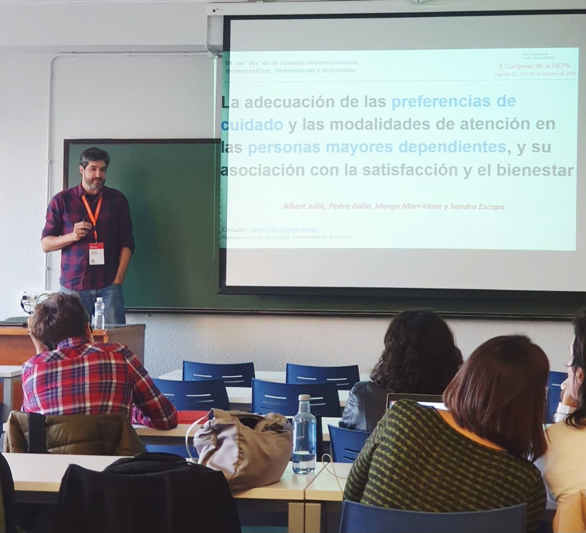 La primera comunicación, titulada La adecuación de las preferencias y modalidades de atención a las personas mayores dependientes, y su asociación con la satisfacción y el bienestar, fue presentada por Albert Julià, Pedro Gallo, Marga Marí-Klose y Sandra Escapa en el Panel 4: Los “des” de los cuidados: desinstitucionalizar, desmercantilizar, desfamiliarizar y desfeminizar. Los resultados, procedentes del proyecto DEPCURA, muestran que cerca del 70 % de las personas mayores dependientes en Barcelona no reciben los cuidados que prefieren, lo que pone de manifiesto la necesidad de políticas públicas que promuevan modelos de atención más flexibles y centrados en el hogar.