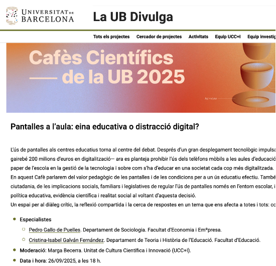 El pasado 26 de septiembre tuvo lugar el primer café científico de la UB de este curso académico 2024-25 con el título “Pantalles a l’aula: eina educativa o distracció digital?”. El Dr. Pedro Gallo participó aportando la visión desde la sociología y presentando la evidencia científica disponible sobre las consecuencias de la exposición a pantallas y en especial qué se conoce sobre sus efectos de su uso en el aula. La sesión contó con la presentación de la vicerrectora Dra. Maria Feliu, la aportación desde la pedagogía de la Dra Cristina Galván, y la moderación de Marga Becerra. Los cafés científicos de la UB son un fantástica iniciativa que recomendamos a todxs.