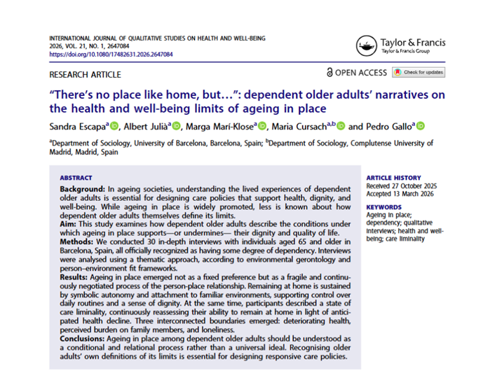 - Escapa, S., Julià, A., Marí-Klose, M., Cursach, M., & Gallo, P. (2026). “There’s no place like home, but…”: dependent older adults’ narratives on the health and well-being limits of ageing in place.